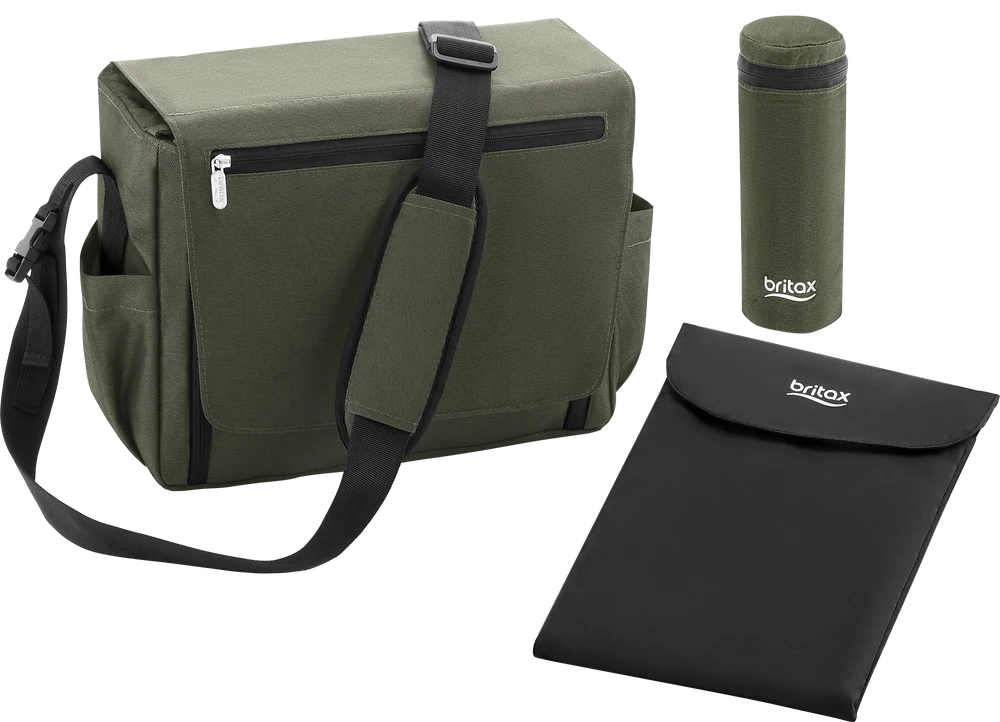 Die Britax Wickeltasche ist abwaschbar und wird mit einer Wickelunterlage, einer Kühltasche und reichlich innerem und äußerem Stauraum geliefert.