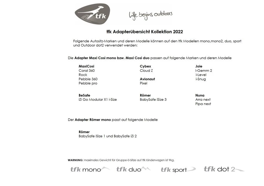 Auf tfk Wagen passen die meisten Gruppe-0-Sitze der Markenhersteller von Maxi Cosi, Römer (nur BabySafe iSize 3), Kiddy, Joie, Cybex, BeSafe. Eine genaue Auflistung der passenden Gruppe 0 Sitze für TFKsaktuellen Kinderwagen findest du in der Übersicht unter dem Produktbild!